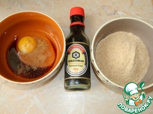 В одну чашу насыпаем сухари, в другой смешаем яйцо и соевый соус Киккоман.