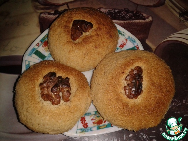 Лепим печенье размером с теннисный шарик, ставим половинку ореха и немного сплюснем выкладываем на пртивень