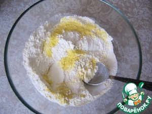 Соединить кукурузную и пшеничную муку, разрыхлитель теста, соль на кончике ножа, ванильный сахар.