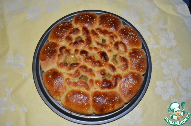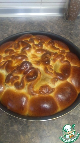 И - как итог - пирог при выпекании немного потёк (сами булочки слепились, к моему удивлению, нормально
