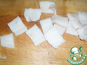 Камбалу нарезать на порционные ломтики. Я резала мельче, примерно 4х4см.