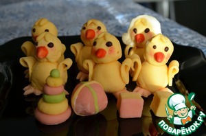 Для приготовления мастики необходимо маршмеллоу нагреть в микроволновке для увеличения объема. Затем постепенно добавить сахарную пудру и 1 ч.. л. сливочного масла, быстро перемешивая. Должна получится масса, напоминающая пластилин. Добавляя разные красители, лепим нужные фигурки. Рецептов приготовления мастики очень много, я выбрала этот.