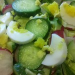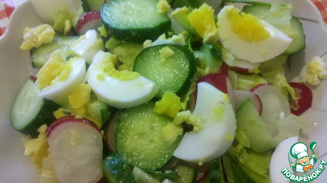 После зимы у всех нас недостача витаминов и мы все должны кушать петрушку, укроп, листья салата, редиску, молодые огурчики. Зелень богата витаминами группы В: В1, В2, В3, В5, В6, В9, В12; C, H, E, K, также содержит бето каротин. Эти витамины нам необходимы и такие салаты нужно кушать, большими порциями. Также к салату на 1 порцию, я добавила 1 домашнее яйцо пашот, в результате мы получаем отличное сочетание продуктов. Готовьте с удовольствием и приятного аппетита!