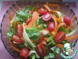 Помидоры черри разрезать пополам, салат порвать, всё перемешать.