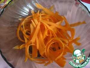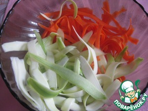 Кабачок сначала с помощью овощечистки очистить от кожицы, а потом нарезать лентами