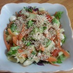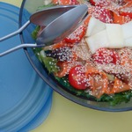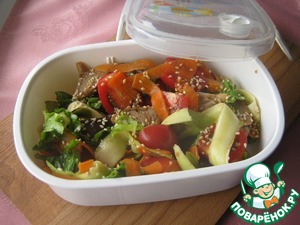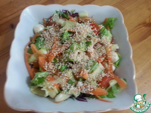 Полить салат заправкой, перемешать, сверху посыпать семенами кунжута, обжаренного на сухой сковороде.