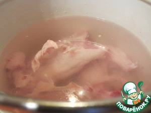 Куриную грудку и кости помещаем в кастрюлю, заливаем водой и ставим вариться бульон. Как закипит, снимаем пену, солим и варим 30 минут на медленном огне.