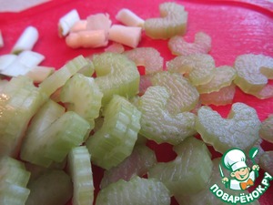 Белую часть зеленого лука нужно нарезать тонкими полосками, сельдерей тонко нарезать.