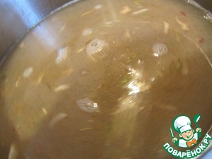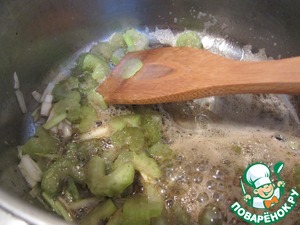 Перец, чеснок и пряности вынуть. Положить в кастрюлю зеленый лук и сельдерей, немного обжарить, посыпать мукой и подрумянить.