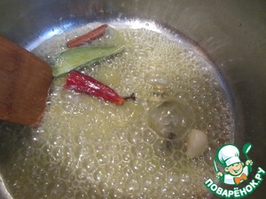 Сливочное масло разогреть в кастрюле. Чеснок очистить и вместе с перцем чили и другими пряностями обжарить 2-3 минуты.
