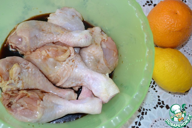 • Для данного блюда я выбрала куриные голени. Подойдут любые части, те которые вы больше любите. Маринад для них приготовим из лимонного и апельсинового сока, и соевого соуса.