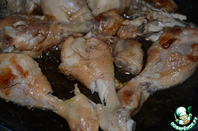 • Смешиваем ингредиенты для маринада, кладём в него куриные голени, втираем маринад в мясо и оставляем часа на два мариноваться (можно и дольше), несколько раз переворачиваем. Маринад не выливать, он нам еще пригодится.