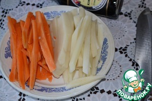 • Обжариваем морковь и картофель сначала на масле, а потом добавляем 2ст. л. соевого соуса, базилик и молотый имбирь.