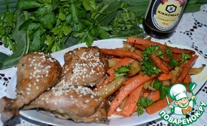 • Овощи подаем с куриными голенями, посыпав семенами кунжута и зеленью. Приятного аппетита!
