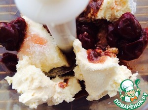 В блендер сложить: творог, сливки (жирные!), ванильный сахар, влить шоколадную массу и вишни. Взбить секунд 20.