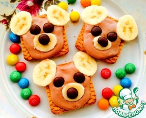 И украшаем. Уши и посредине морды - банан. Глаза и нос я делала из конфет M&Ms, но можно заменить на изюм, чернику... что угодно темного цвета! Вот и все)