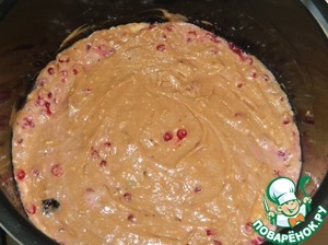 На дно чаши выливаем половину теста, выкладываем порезанный чернослив и смородину. Я брала замороженную (не размораживала).