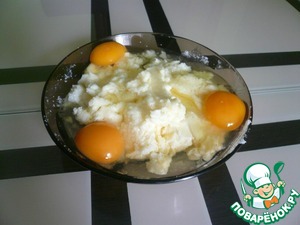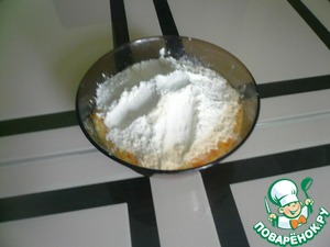 Добавить муку, соду (гашенную уксусом) или разрыхлитель, замесить не крутое тесто.