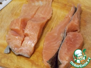 Филе разрезать на 2 куска. Теперь каждый кусок разрезать по середине до кожи и сложить кожей во внутрь. На вид получается как стейк. Мне очень эта идея понравилось.