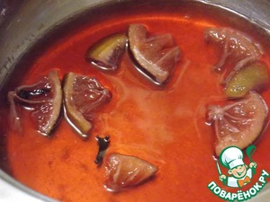 Сначала делаем соус. Для этого в кастрюлю наливаем вино, кладем сахар, пряности и дольки лимона. Варим 15 мин. Хлебный мякиш порезать кубиком и немного обжарить на сухой сковородке. Положить в соус и проварить 10 мин. Снять. Посолить и поперчить. Он получается средней густоты и хлеб совсем не ощущается. Даже не догадаешься, что он там есть.