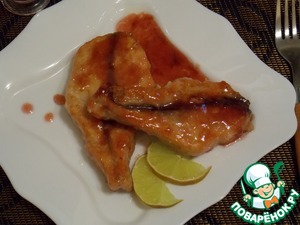 Очень пикантная, кисло-сладкая с ароматом специй. Соус очень вкусный получается после жарки рыбы. Я остатки со сковородки счищала. Этот соус прекрасно подойдет к ребрышкам, птице и мороженному.