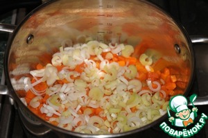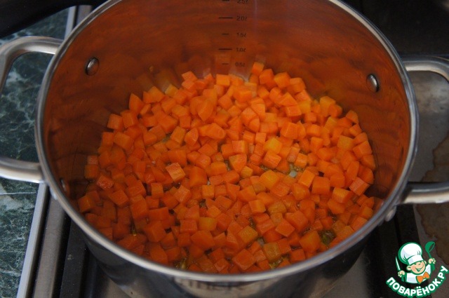 В кастрюле с толстым дном разогреть масло и обжарить морковь в течение 5-7 минут,