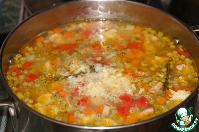 Выключить огонь, добавить в суп измельченный чеснок и дать супу настояться под крышкой 10 минут.