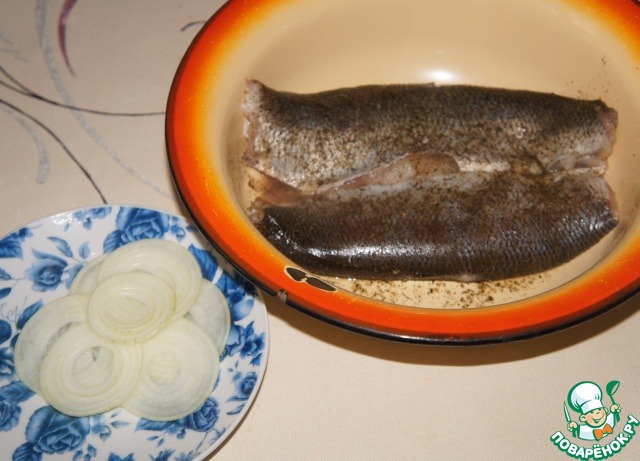 Сверху поместить рыбу и снова посыпать колечками лука.