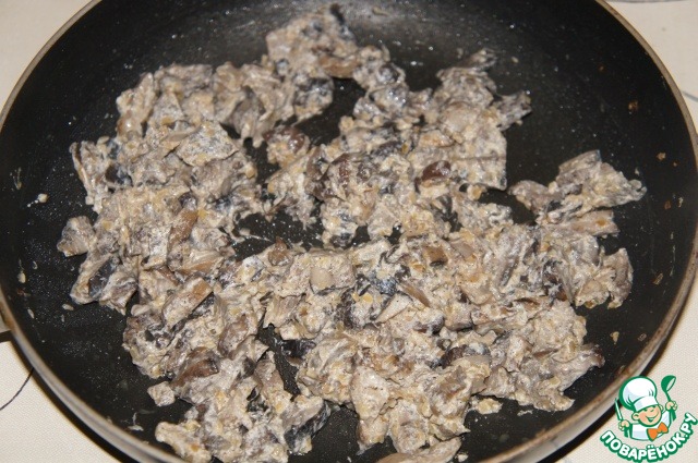 По-моему, дело было так: крупу замачивали в сметане на ночь, она разбухала и начинку сверху ещё смазывали сметаной. Начинка получалась очень классной - крупинка от крупинки, а вкус
