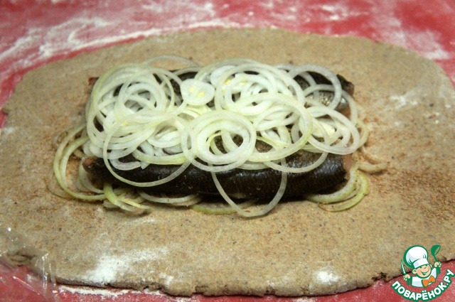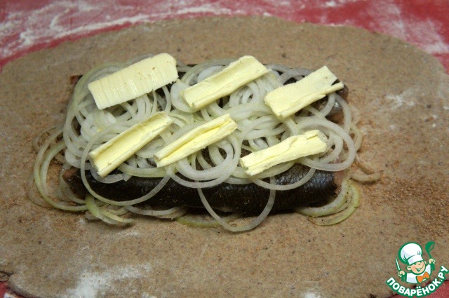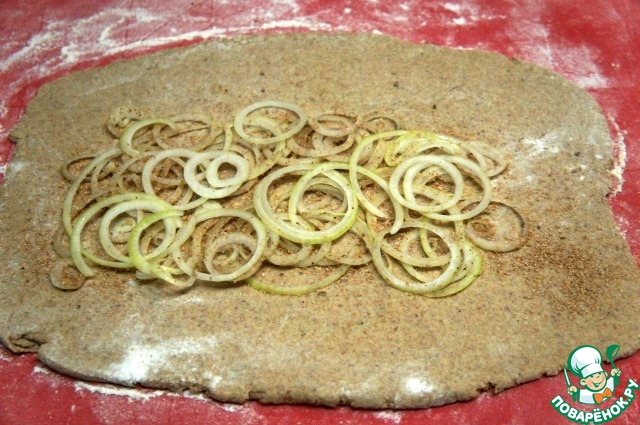 Для рыбника тесто раскатать в прямоугольник толщиной 0,7 мм, центральную часть слегка посыпать сухарями или отрубями, выложить слой колечек репчатого лука.