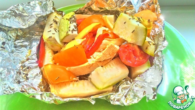 Такой конвертик получается очень сочным: кунжут не только защищает сыр от плавления, но и пропитывается соусом и одновременно становится незаменимой вкусной сочной частью здорового питания! Остальные овощи также не остаются без внимания данного соуса - они тушатся в нём в закрытом состоянии фольги, ароматизируясь розмарином... Очень вкусные, незабываемые ощущения! Приятного аппетита!