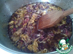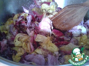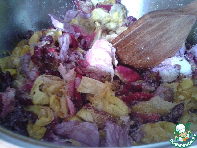 Засыпать сахарм и тщательно перемешать, как бы растирая лепестки с сахаром при помощи деревянной лопатки.