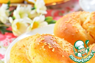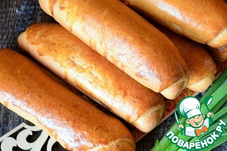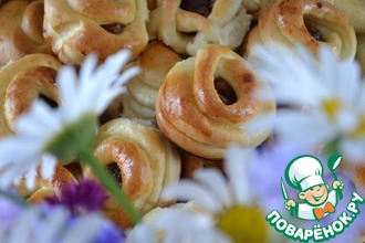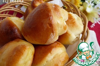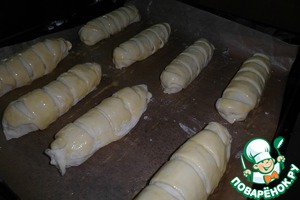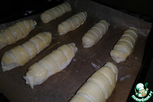 7. Булочки выкладываем на противень, застеленный пергаментом, оставляем на 25 минут, накрыв полотенцем, затем смазываем их слегка взбитым желтком. Выпекаем при температуре 200 гр.15-20 минут.