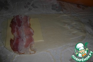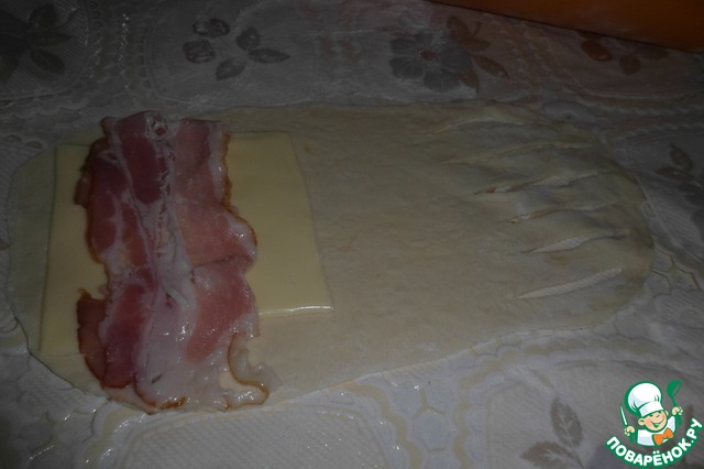 5. Каждый кусок теста раскатываем в тонкие прямоугольные пласты, на один край кладем сыр и сверху накрываем двумя полосками бекона, а второй край надрезаем, как показано на фотографии.