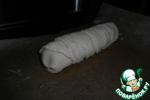 6. Затем сворачиваем рулетик (не плотно), начиная с края, где находится сыр, и защипываем края (обязательно, а то сыр вытечет).