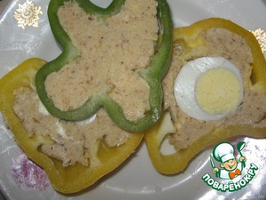 Отвариваем яйца вкрутую. Начиняем полученной массой перцы, в серединку вставляем яйцо.
