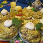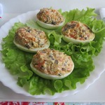 Все перемешиваем. Начинка должна держать форму и быть соленее, чем вам привычно. В сочетании с пресными белками будет как раз. Начинкой наполняем половинки яиц. Подаем с майонезом.