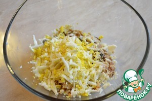 На крупной терке натрите 2 вареных яйца.