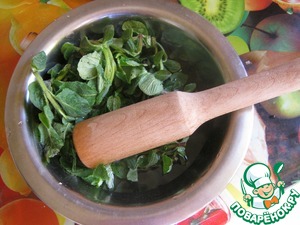 Мятушку заливаем водой, где-то около стакана, и хорошенько толчем.