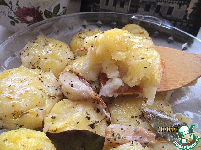 Через 30 минут достать картофель. Интересный момент: взять толкушку для пюре и слегка надавить на каждую картофелину, чтобы она немного размялась. Затем залить ароматной смесью и снова отправить в духовку на 20-25 минут.