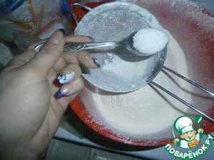 Делаем крошку мучную. Первой я кладу муку, соду и лимонную кислоту все через сито просеиваю для равномерного распределения.