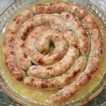 На этом фото видна колбаса в сыром виде. Набита фаршем она довольно плотно, цвет на этом этапе - пока непривлекательный, серый. В таком виде я отправил колбасу в холодильник, где она пролежала у меня около суток. Потом я и вовсе всю колбасу заморозил в морозильнике - в тот момент у меня не было времени заняться последним этапом изготовления колбасы - варкой.