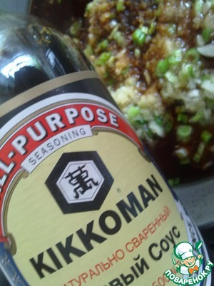 • Влейте сначала 1ст. л. рисового уксуса, а затем соевый соус 100мл Kikkoman. Готовьте на сильном огне 2 минуты.