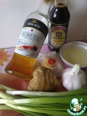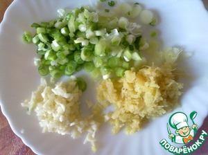 • Свежий корень имбиря очистить и натереть на мелкой тёрке. Чеснок измельчить ножом. Отрежьте белую часть зелёного лука и мелко нарежьте.