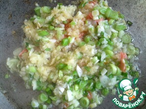• Снимите с огня, сразу же всыпьте оставшуюся часть зелёного лука.
