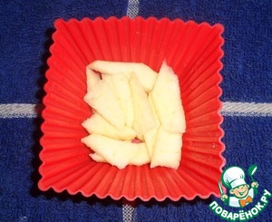 • Яблоко очистить, нарезать на кусочки и кладем на дно формочки для запекания.