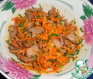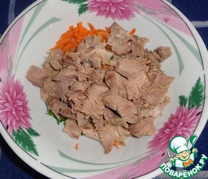 • Мясо отварить в подсоленной воде и порезать на небольшие кусочки.