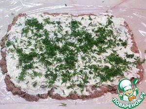 Затем смажьте плавленым сыром и посыпьте рубленой зеленью.