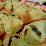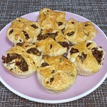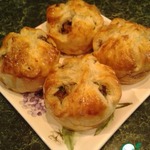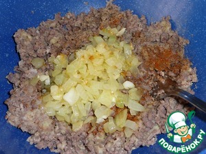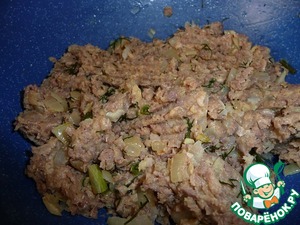Тесто немного подкатать, заполнить формы для маффинов (у меня силиконовые, не надо смазывать маслом), наполнить фаршем.