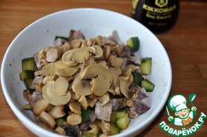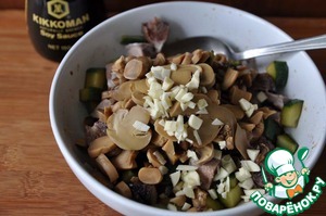• Режем маринованные шампиньоны и добавляем к мясу и огурцам.
